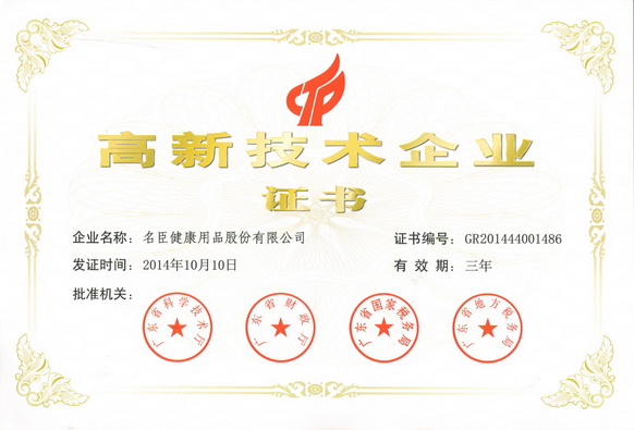 经国家知识产权局审核,确定名臣健康用品股份有限公司为2016年度国家知识产权优势企业。5月3日,在汕头市知识产权工作会议暨专利奖表彰大会上,市领导向名臣健康颁发了“国家知识产权优势企业”牌匾。